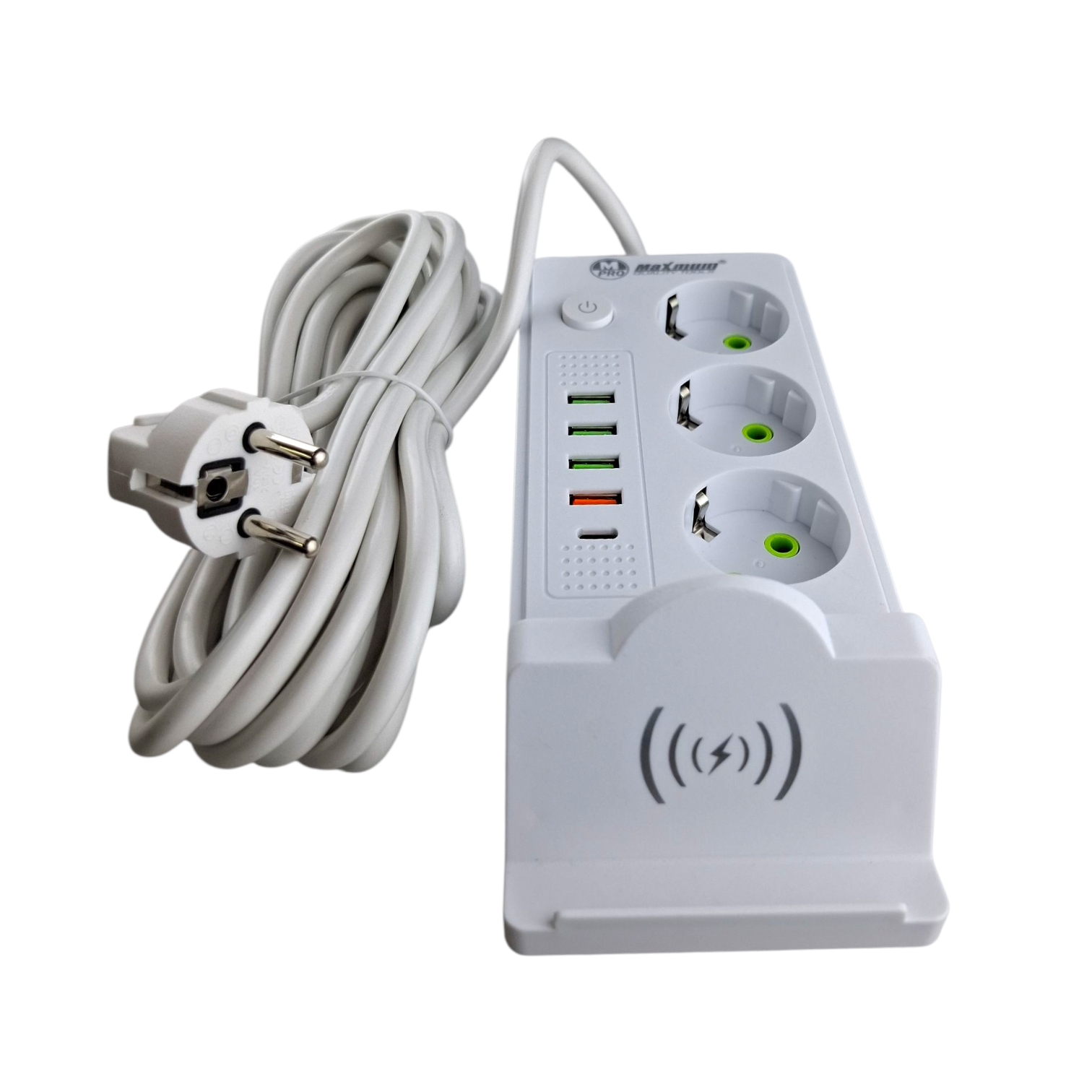 Удлинитель электрический с беспроводной зарядкой 5 метров от "Maximum Quality Tools" оборудован тремя розетками евро типа с заземлением, а также 4 USB портами и входом Type C.