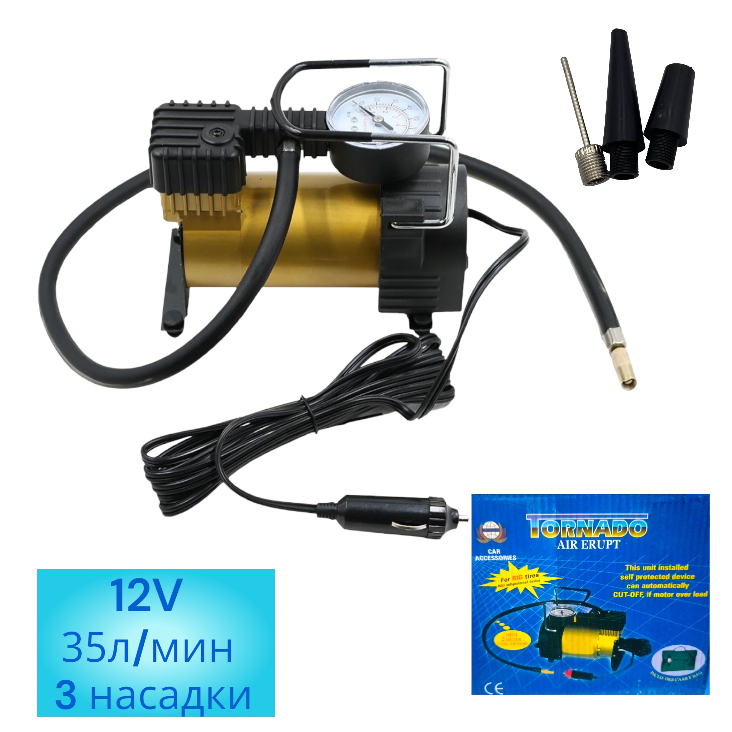 Автомобильный компрессор «Tornado» AС 580 35 л/мин с максимальным давлением 7 ATM поможет поддержать правильное давление в шинах, накачать игрушки и спортивное оборудование, а также использоваться для питания пневматических инструментов. Электрический компрессор можно подключить к прикуривателю автомобиля. Электрический компрессор с напряжением 12 V — это безмасляный поршневой компрессор который обеспечивает высокое давление и позволяет быстро и эффективно накачивать колеса. Медная обмотка и прорезиненная опора поможет прослужить вашему инструменту намного дольше. Комплектация включает металлический манометр, который показывает точное давление в шинах, шланг, а также дополнительные насадки для накачивания мячей, надувных матрасов и других предметов. Время непрерывной работы 15 минут.