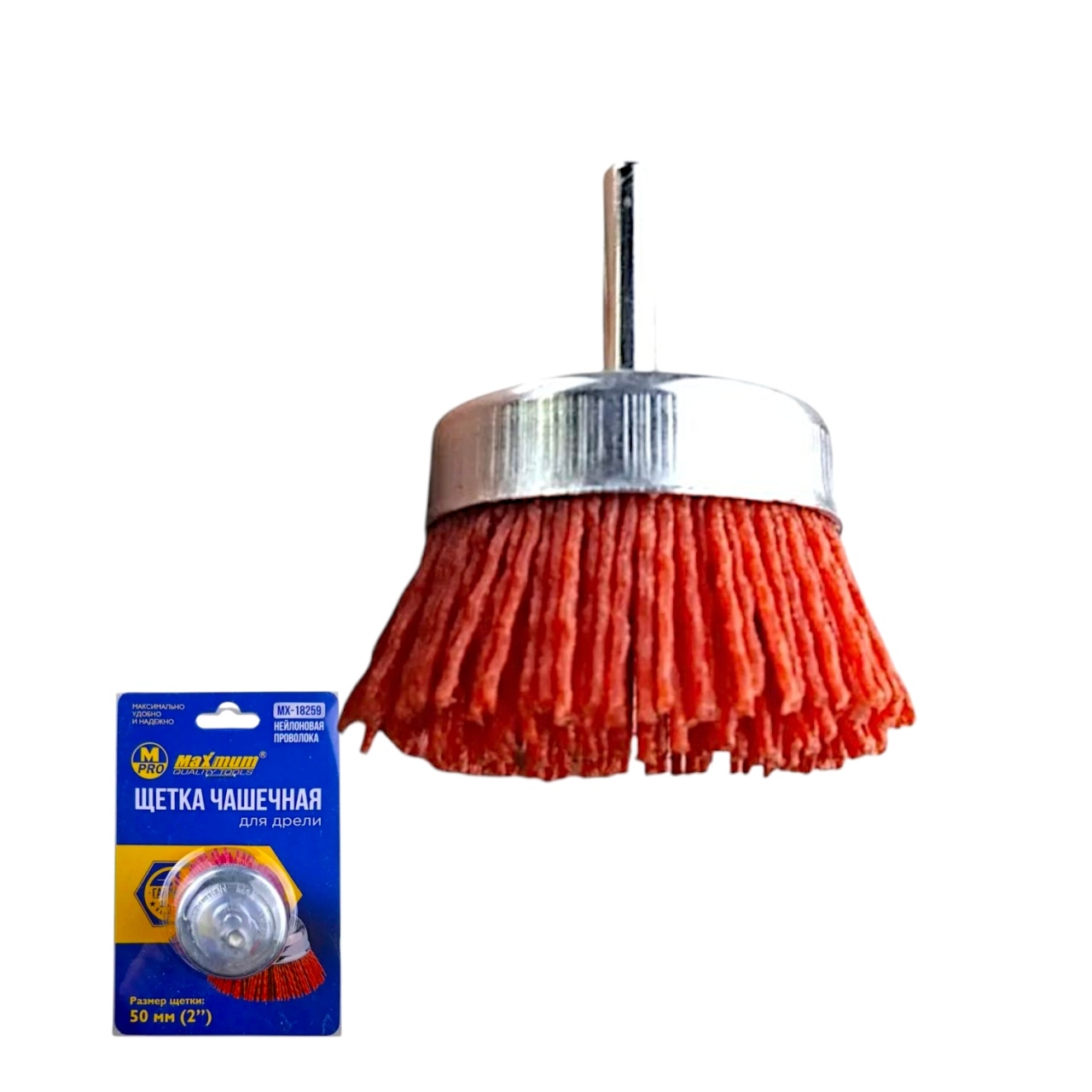Это нейлоновая щетка-чашка (диаметром 50 мм или 2 дюйма), которая крепится в патрон дрели или шуруповерта через резьбовую шпильку. Щетка с нейлоновым ворсом от "Maximum Quality Tools" предназначена для бережной, но эффективной абразивной обработки поверхностей.